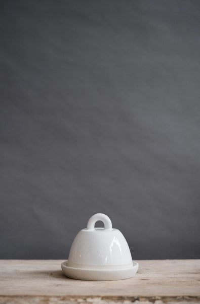 This bell shaped butter dish fits half a pound of butter. This bell butter dish can hold half a pound of butter. Size/Dimension: 5" x 3" (4.5").