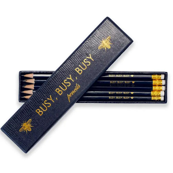An elegant gift or something special for your own desk. Box of 10 Pencils is packaged in a navy blue lizard embossed box with Busy, Busy, Busy and bee icon on each pencil and the box.  Pencils are navy blue with gold lettering and a white eraser.